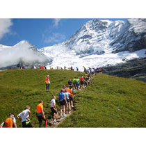 Etwa 6 Stunden unterwegs und weiterhin vergeht die Zeit fast wie im Flug. Über die Moräne, vorbei am (zweiten) Dudelsackspieler und gleich am höchsten Punkt der Strecke mit Blick zum Ziel oberhalb der Kleinen Scheidegg. Und schon ist das Abenteuer Bergmarathon - ganz entspannt und mit Genuss - gemeistert.